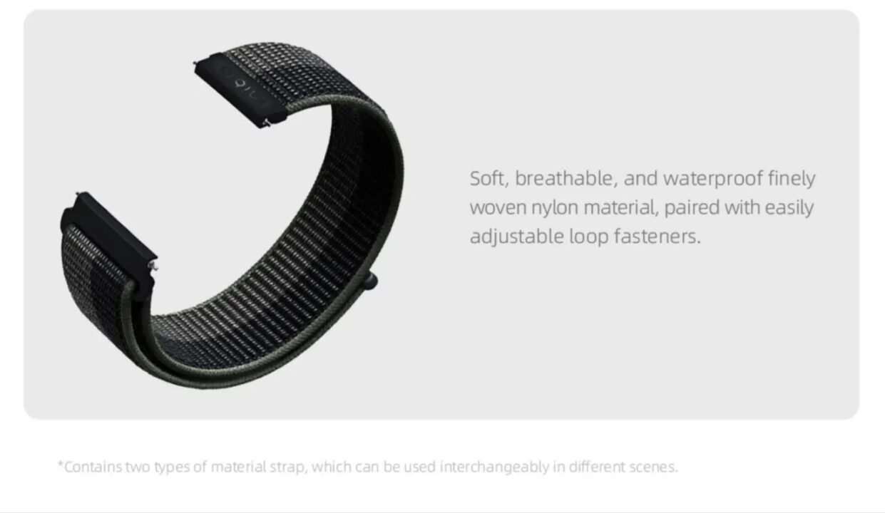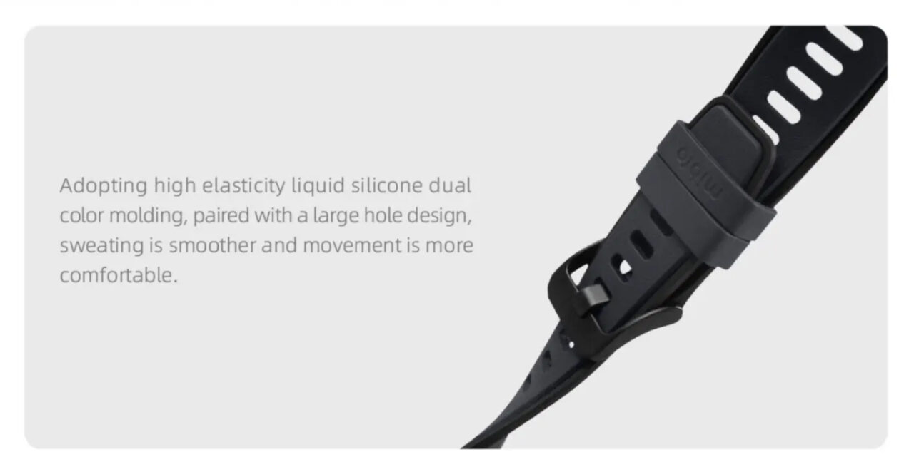 הרצועות עשויות יציקה כפולה של סיליקון נוזלי אלסטי במיוחד עם עיצוב חורים גדול המאפשר אוורור משופר ונוחות מרבית במהלך פעילות גופנית. קיימות גם רצועות ניילון ארוג עדינות, רכות, נושמות ועמידות במים עם אבזמי לולאה להתאמה קלה. השעון עמיד במים עד 5ATM, כך שתוכלו לענוד אותו בביטחון בזמן שחייה ומקלחת.