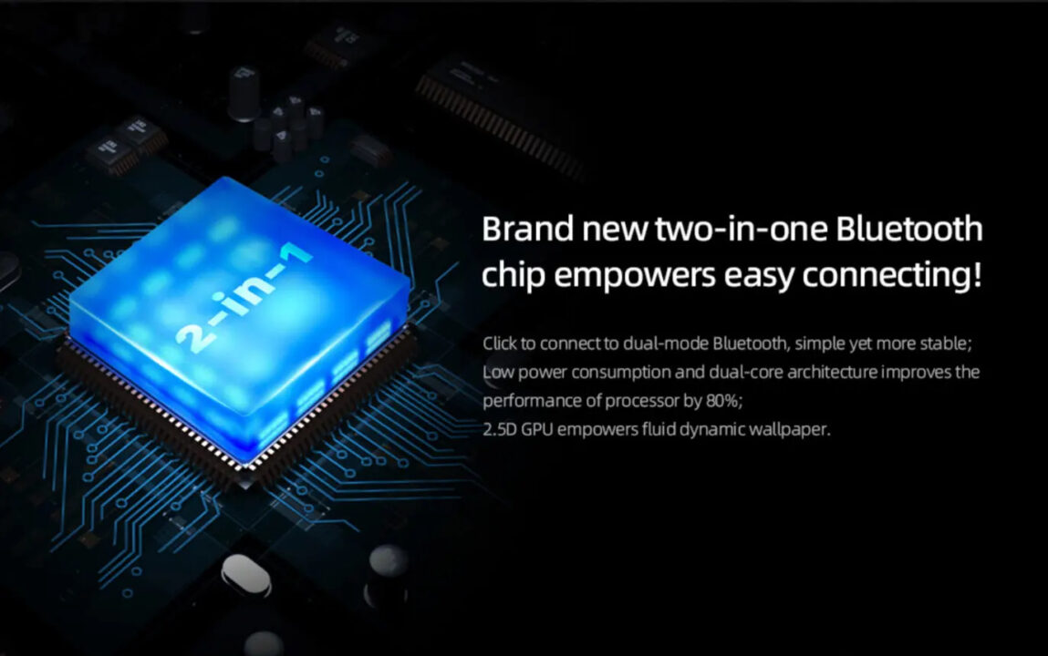 שבב Bluetooth חדשני “שניים באחד” מאפשר חיבור קל ויציב במיוחד. פשוט לחצו כדי להתחבר ל-Bluetooth במצב כפול. ארכיטקטורת ליבה כפולה חסכונית בצריכת חשמל משפרת את ביצועי המעבד ב-80%, ו-GPU 2.5D מאפשר טפטים דינמיים נוזליים ומראה שיחות אלגנטי יותר.