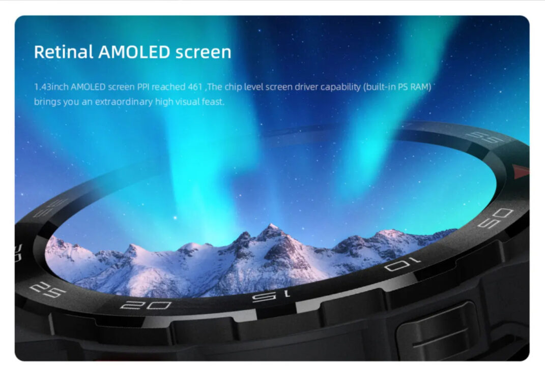 - מסך: AMOLED בגודל 1.43 אינץ’, רזולוציה 461ppi