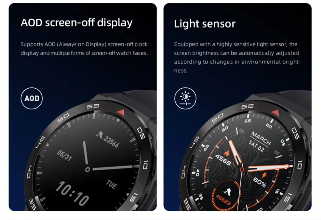 התענגו על תצוגה מרהיבה על גבי מסך AMOLED רשתית בגודל 1.43 אינץ’ עם רזולוציה מרשימה של 461ppi. טכנולוגיית ניהול תצוגה ברמת השבב (PS RAM מובנה) מעניקה חגיגה ויזואלית יוצאת דופן. בנוסף, השעון תומך בתצוגת Always-On Display (AOD) עם מגוון סגנונות שעון כבויים לבחירה. חיישן אור רגיש במיוחד מתאים את בהירות המסך באופן אוטומטי לתנאי הסביבה לנוחות מרבית.